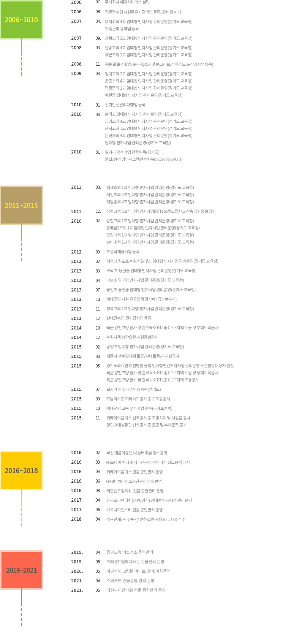 HOME 오시는길 회사소개 - 인사말 - 연혁 - 오시는길 사업영역 - 민간투자사업 - 시설관리 - 전문건설 - 전기안전관리 주요현황 - 주요실적 - 자격 및 인증 고객지원 - 공지사항 - 질문과 답변 - 채용공고 온라인상담 - 온라인문의 공지사항 찾아오시는길 온라인상담 주요실적 개인정보처리방침 연혁 연혁 회사소개연혁